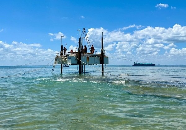 Esse é o andamento da etapa de operações em terra já que, na região de borda do mar, a lâmina d’água é pequena. As perfuratrizes vão retirar fragmentos do solo no local onde serão instalados pilares da Ponte. Em seguida, os materiais serão analisados por laboratórios especializados, responsáveis por oferecer relatórios detalhados com informações sobre o solo da área.